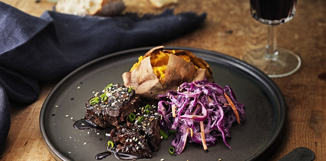 Glaseerattu ylikypsä naudan etuselkä, paistettu bataatti ja kaalisalaatti - tämän herkullisempaa ei ole! Kokeile tämä ylikypsä naudan etuselkä resepti!