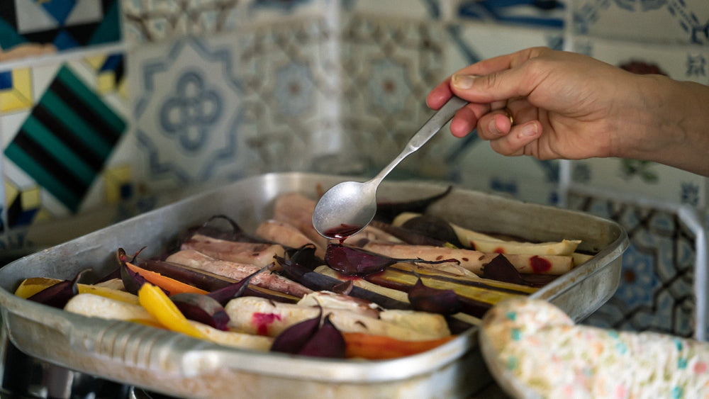 - Asettele juurekset sipuleiden päälle ja pirskottele päälle oliiviöljyä ja merisuolaa. Laita uuniin siksi aikaa kun valmistat punajuuriglasyyrin.