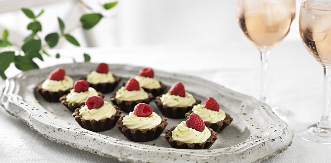 Pienet suklaatartaletit kruunataan valkosuklaamoussella ja vadelmilla.