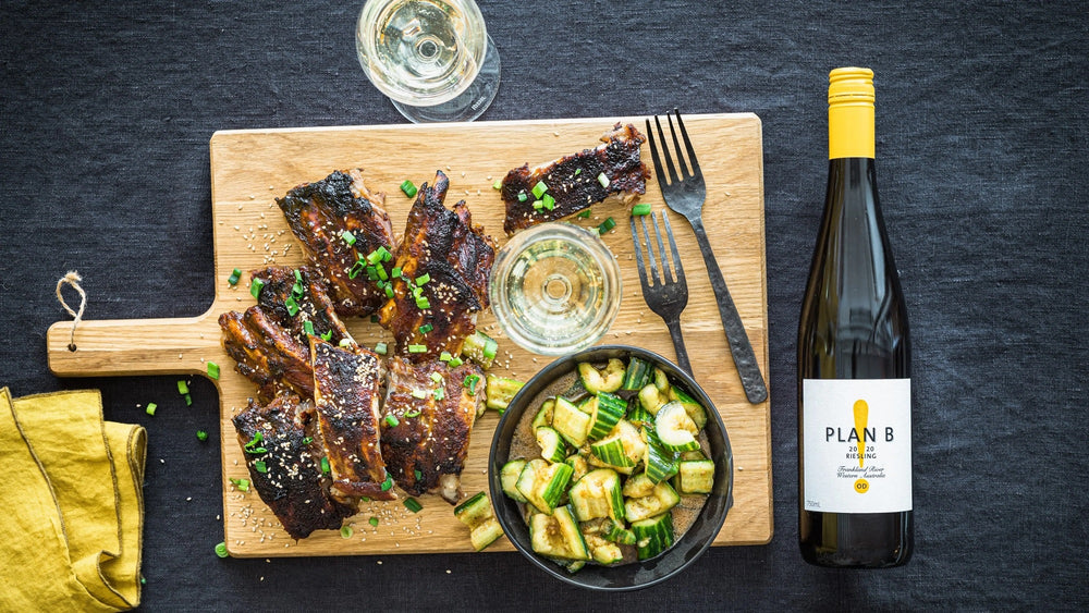 Ruokatoimittaja Mari Moilasen porsaan ribsit ja murskekurkut maistuvat australialaisen Plan B Rieslingin kera!