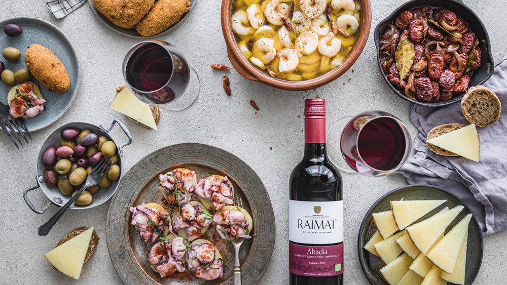 Luonnonmukaisesti tuotetut Raimatin viinit henkivät espanjalaista makumaailmaa ja kruunavat tapasillallisen. Raimatin tuoteperheestä suosittelemme niin valkoviiniä kuin punaviiniä näiden herkkujen kanssa nautittavaksi. Lisäksi suosittelemme suuremmalle seurueelle hanapakkauksessa saatavaa punaviiniä.