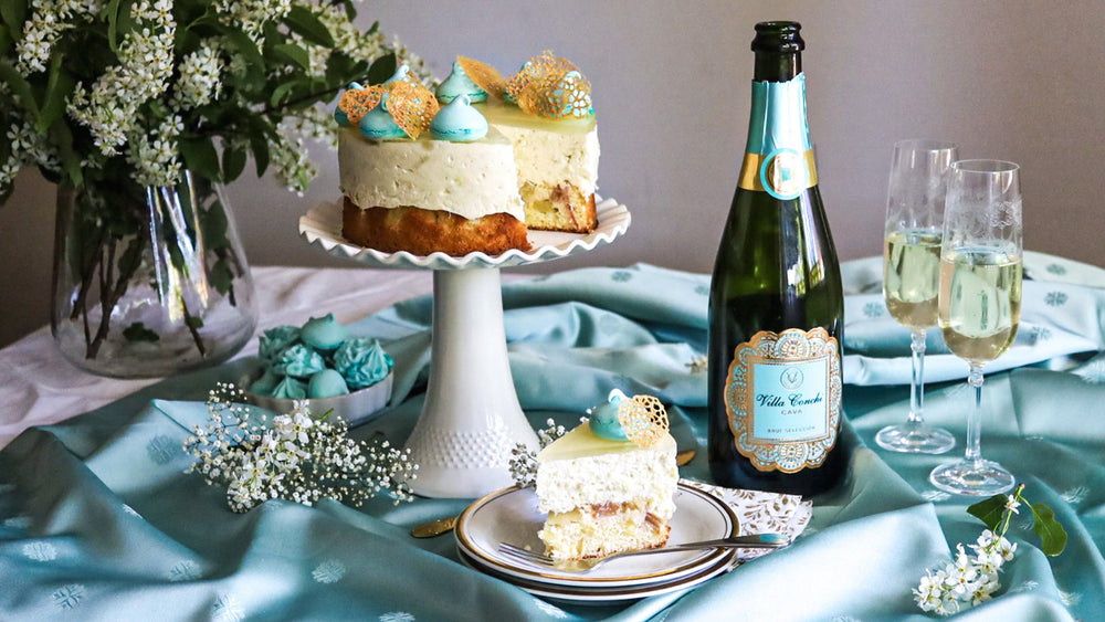 Kakkukatri loi upean raparperi-kuohuviinijuustokakun, jossa maistuu raparperin lisäksi raikkaan hedelmäinen Villa Conchi cava. Villa Conchin kaunis pullo sopii loistavasti juhlakattauksiin ja Kakkukatri inspiroitui myös koristelemaan kakun Villa Conchin juhlavaan etikettiin sopivaksi. Etiketti puolestaan on aikanaan saanut inspiraationsa kakkupaperista. Kakussa on mehevä raparperipiirakka pohjana ja cavaa on käytetty niin täytteessä kuin kiilteessäkin. Testaa ja hurmaa vieraasi!